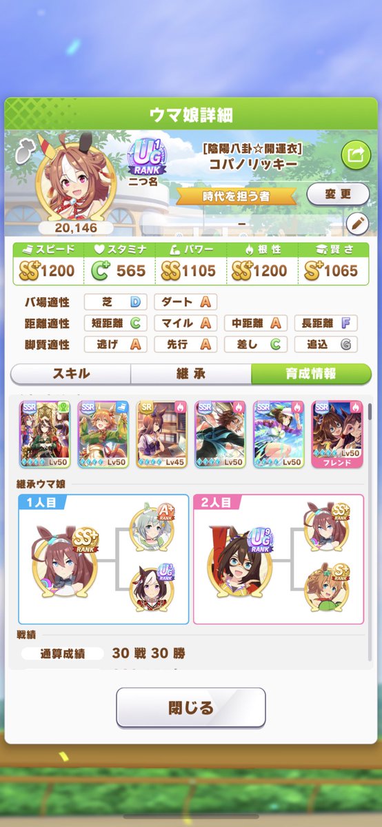 コパノリッキーは芝適性上げてレースたくさん出る育成方針が良さそう。出走レースダートのみで育成してみました!ダートレース増えたことによって親が非常に自由度あると思います。まあ自分は芝適性上げますけど… #ウマ娘 #コパノリッキー pic.twitter.com/3OGgVVwLTC武豊の「この馬じつは芝だったかもしれん」発言を聞いて芝適性がGじゃなくてFになってるリッキーさんいいですよね