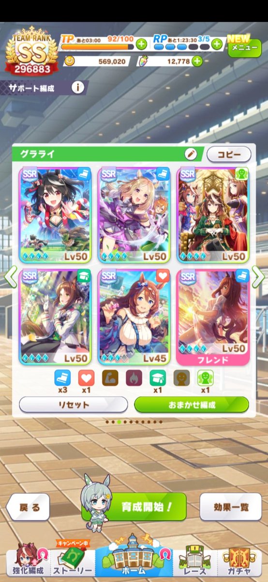 グランドライブは友情トレ重視かぁ。となるとやっぱ玉座は強いし、根性デッキなら配布スペが入ってくるなぁ