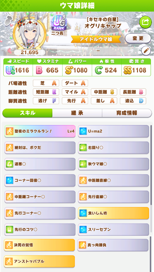 同じ状況でCB外す選択したわ。秋右が強すぎるんだ。コナ回はキタサンもしくは他の回復スキルで妥協する。