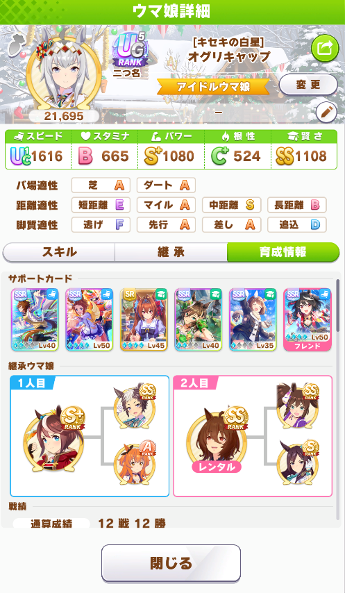#ウマ娘 #ヴァルゴ杯 pic.twitter.com/FyLfT2s0Mgクリオグリ育成秋ウマ、右回り、垂れウマ引っ張ってこれるSSRファインは必須としてノンストのためにユキノ積んだらシービーさすがに積めなくなるのきちいグラライでスピード盛りすぎたら坂回復スキル使えない今回はスタミナ難しいのだ。そこでノンスト積んだクリオグリや通常オグリですよ