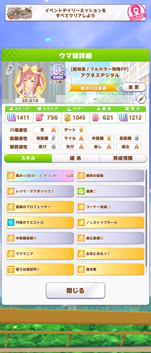 ひとまず何度か育成を試してみて、スピード1600を目指しつつ全体的なステータスはどの程度か見ながらやっていきたいですね~。正直妥協ラインはまだ決められない
