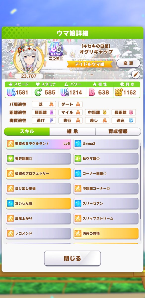 このステータスで凄い点はユキノちゃん1枚と恐らく因子でこれだけ賢さを持っている点ですよね