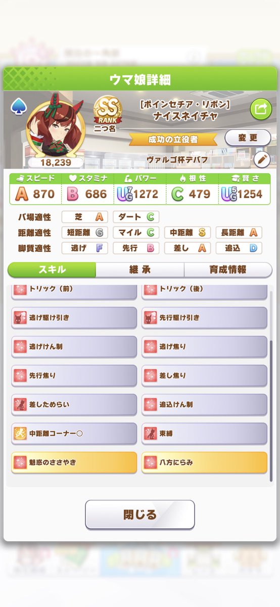 スタミナルドルフちゃんのカード、なるほどなあ。ヒントスキルはデバフ系が揃っているし、中距離系のスキルもありますもんね