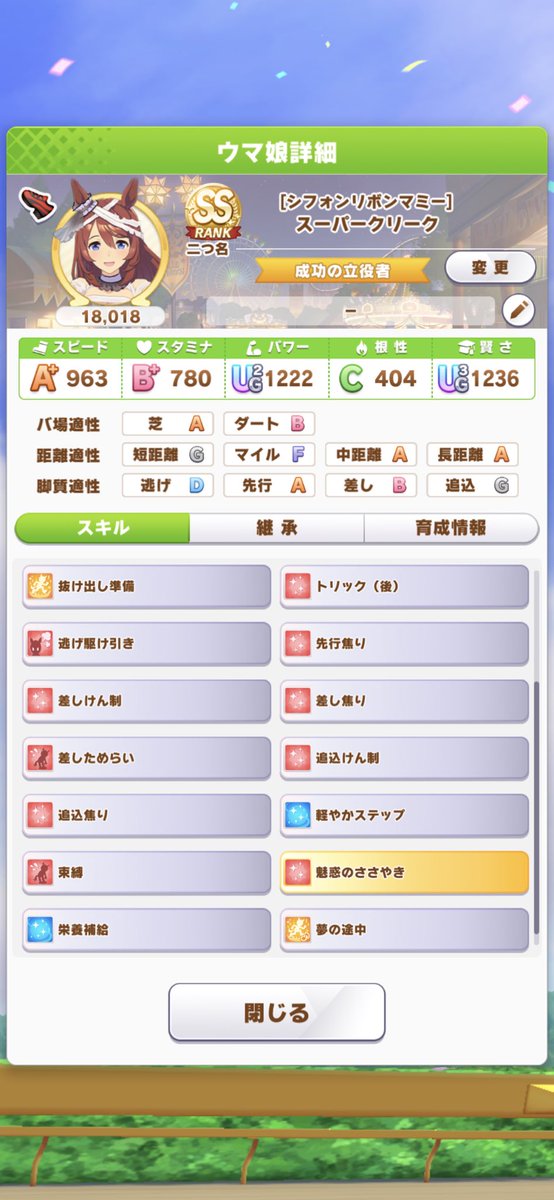 魅惑のささやき+アドベンチャー564のコンボなら実質全員にデバフ有効。発動タイミング遅すぎると意味ないから、そこは運とステも絡んでくるが376: 名無しのトレーナー 2022/09/07(水) 22:52:08.52 ID:yqySxjCt0もう1600目指さずスピ2賢さ2クリークハローが良いかな384: 名無しのトレーナー 2022/09/07(水) 22:53:56.43 ID:YRzZmIW+a>>376