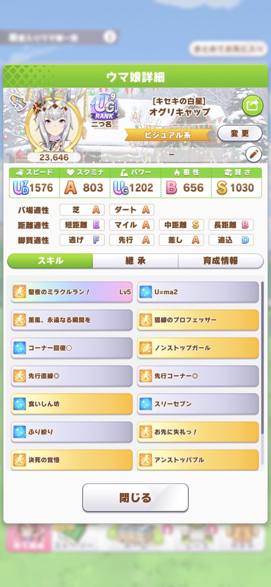 タキオンの決死の覚悟よりファルコのまっしぐらの方が出そうな気がするけどどうなんだろクリオグリの決死の覚悟全然出ないなぁって悩んでたけど、よく考えたら決死の覚悟出ない=最終直線突入時先頭なら大体勝つから良いのか。