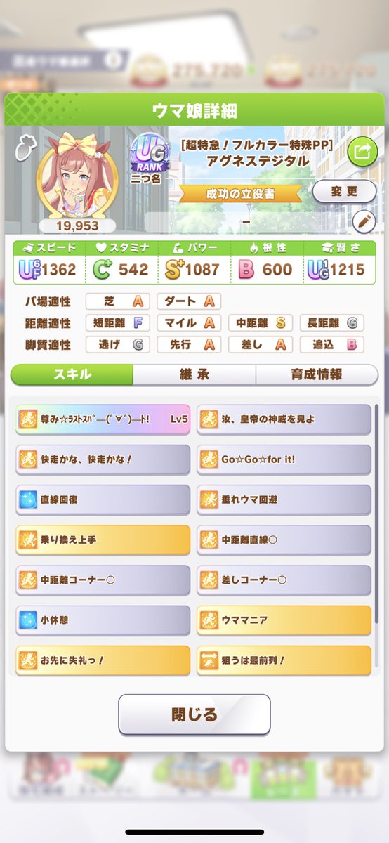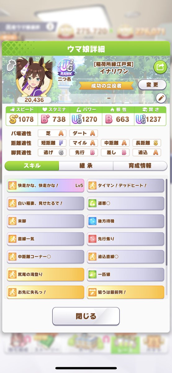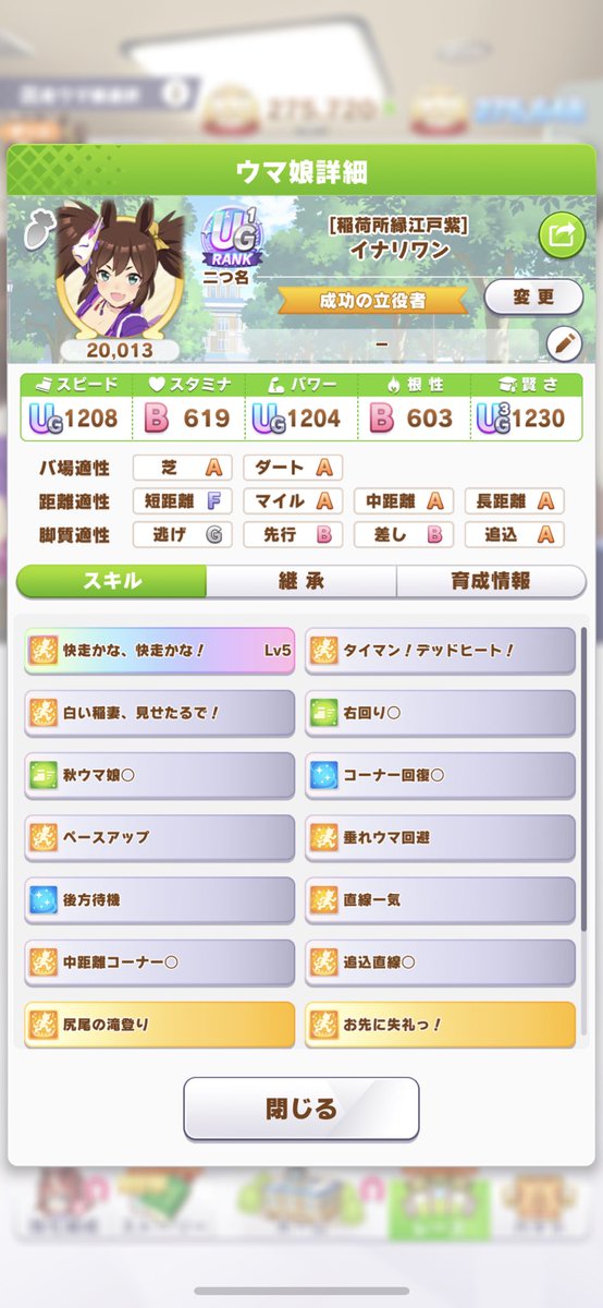 私、イナリちゃんは今回育成していないんですよね~。別の子の話ですがスピード補正がある子は育成がやりやすい