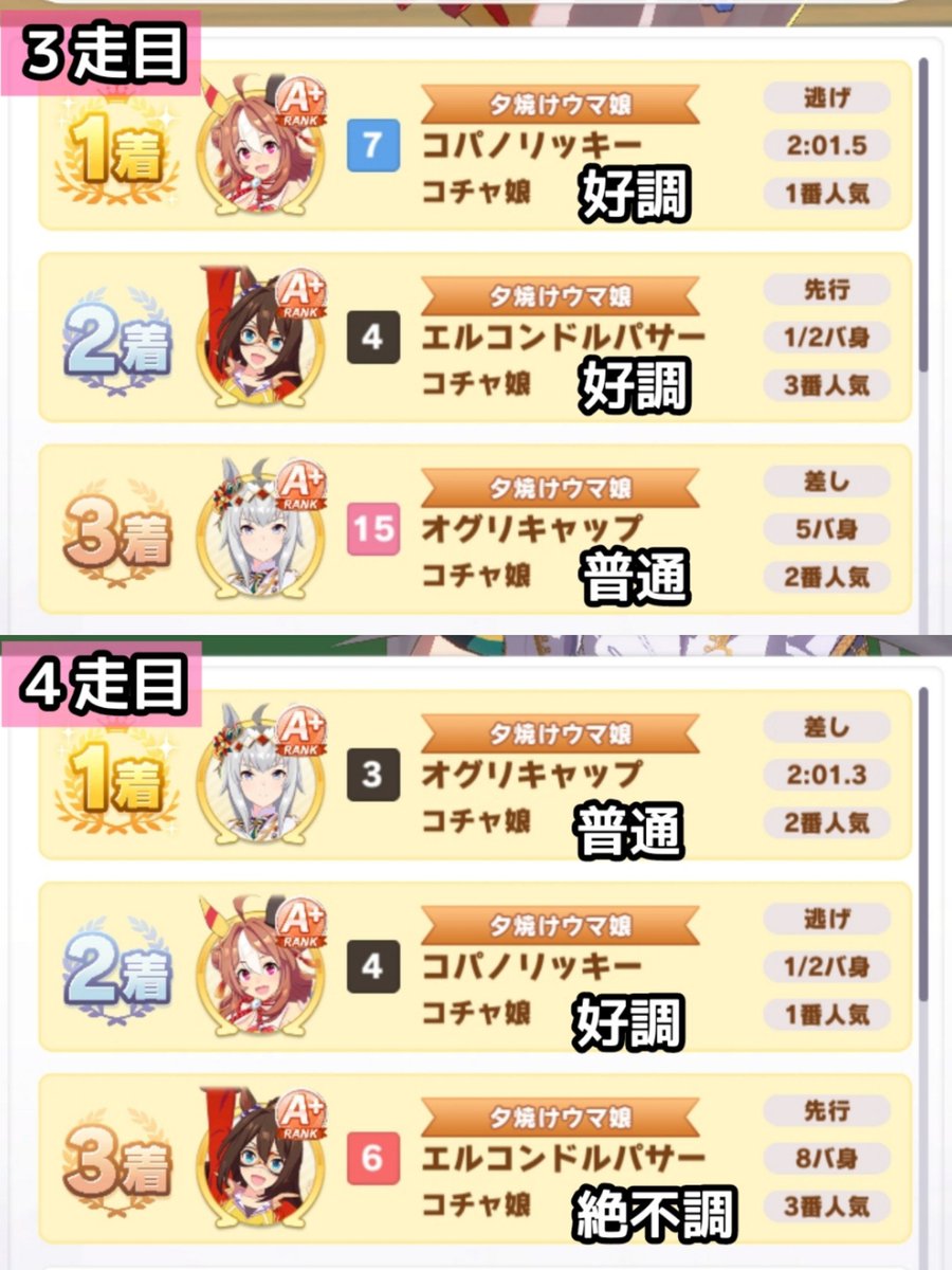 レースを見ていてオグリ1度勝ったけどやり直し最優先😇差しで挑みたいんだけどスキルが噛み合ってない🤔エルは控えもいるからそっちも試走させてから判断かな・・・#ウマ娘プリティーダー