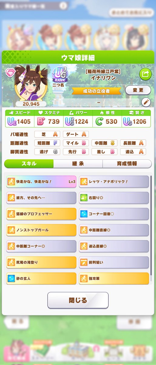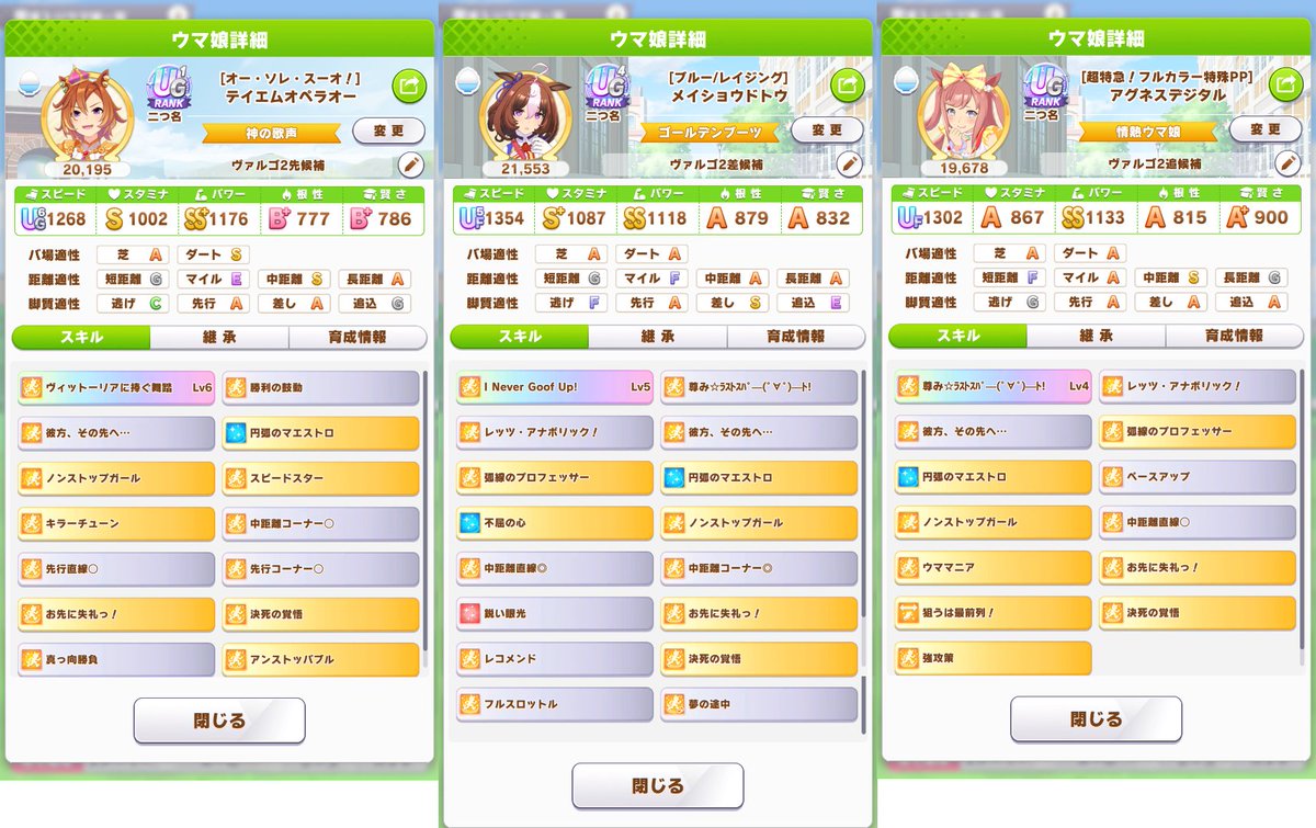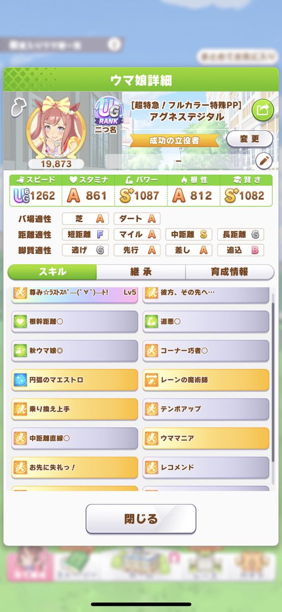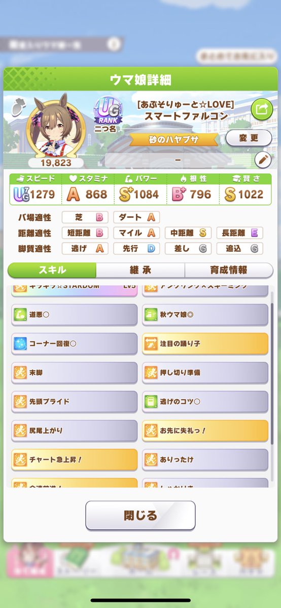 スピードが低いけど、ダートSもついたので一応これで完成。ヴァルゴ杯は逃げファル子、先行オグリ、エルで行こう🐴ヴァルゴ杯なんとか育成完了。クリオグリは根性育成が強いということで急遽育て直し。一発でいいのが育てれました!全身全霊落としたのが痛いのと後9パワーを盛りたかった…。地固めはほぼ発動する。強い。