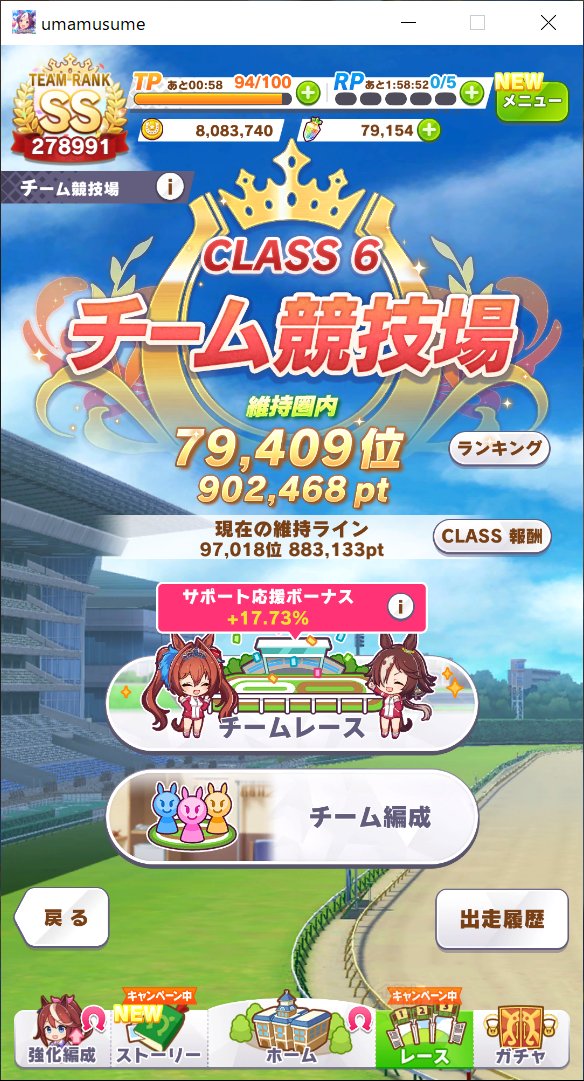 ひとまず100万スコアは行ってるから当分の間は大丈夫と思いたい。長距離を更新したらもっと上がるはずだからヴァルゴ杯が終了したら本腰入れて育成ですね