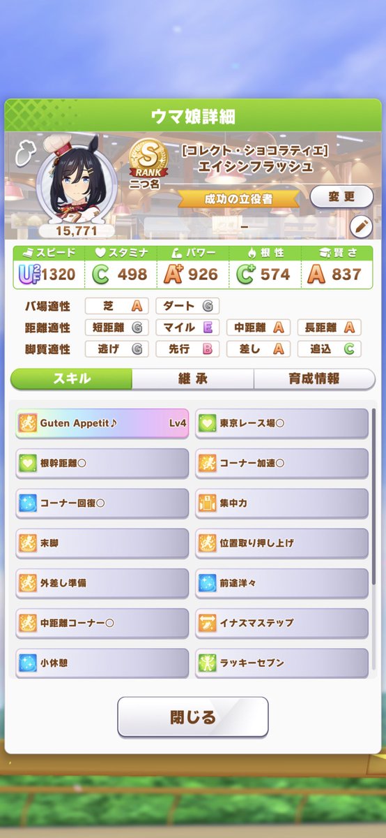目標レースに菊花と春天あってかつ事故りにくいキャラ誰かいないかなって手持ち見てたけどクリークでいいじゃん(じゃんバレンタインフラッシュさん目標に春天があって育成成功した試しがない春天が目標レースにある馬、たぶんもう育成出来ない。