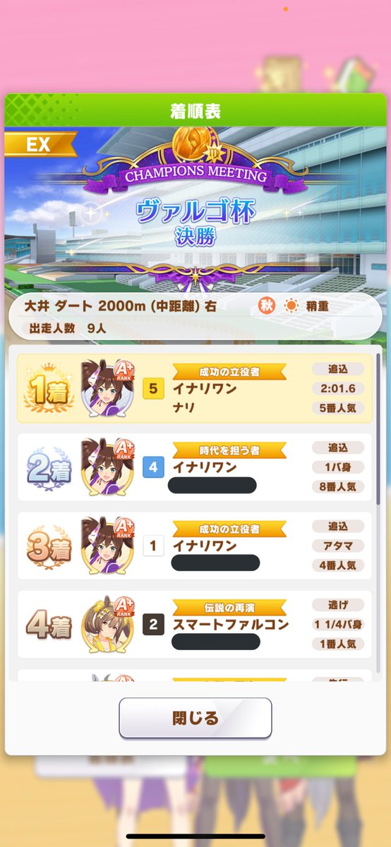 次のチャンミは長距離?マイル? pic.twitter.com/Mtclo3weylヴァルゴ杯決勝改めて見直したけど勝率7割超え、複勝率98%のクリオグリに勝率13%のリッキーが勝っちゃってるよ。