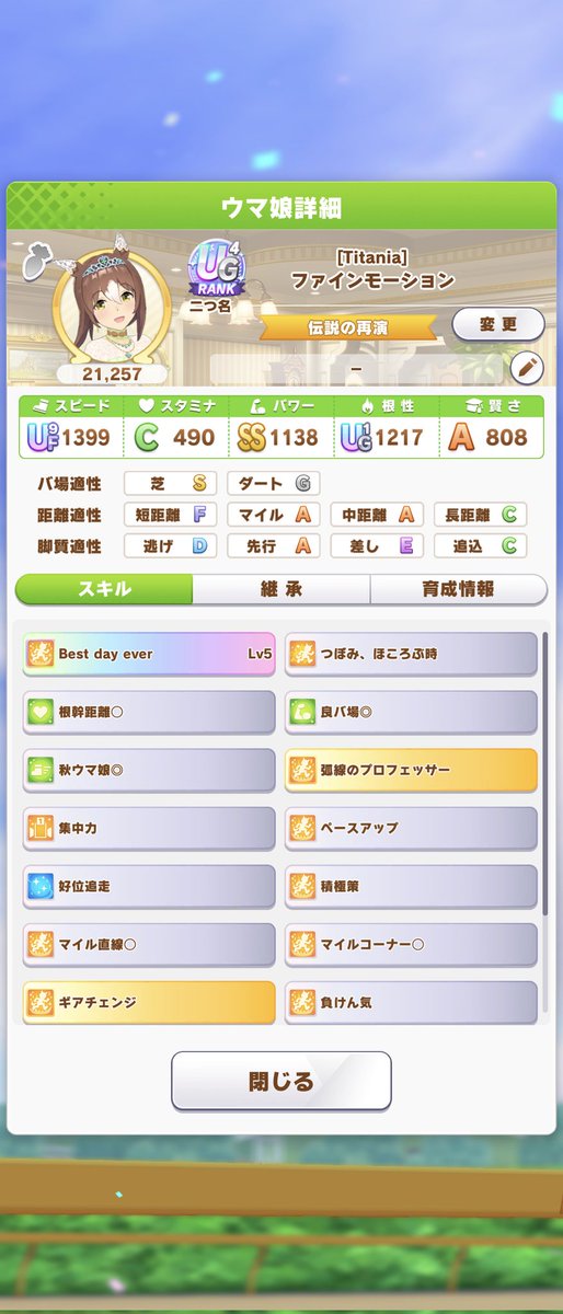 もうライブラ杯の情報来たのね。パッと見根性因子とか強そうな気がするけど、強いマイルの根性因子なんかあるわけもなくライブラ杯今ある分でとりあえず作ってみた。