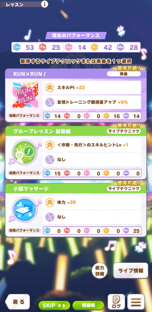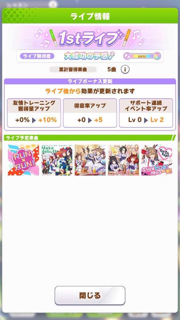 シニア後半はスキポ25のために取れるだけ取るわ849: 名無しのトレーナー 22/10/04(火) 15:09:51 ID:1a.fq.L9スキルPに代わるんやから安いのガンガン回すかな850: 名無しのトレーナー 22/10/04(火) 15:09:54 ID:65.jb.L35普通にステアップ+友情の曲取って後は流れだろ852: 名無しのトレーナー 22/10/04(火) 15:10:23 ID:Z9.tl.L161stライブ→友情15パー確保(余裕があれば得意率)