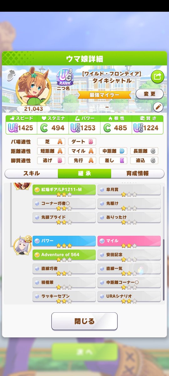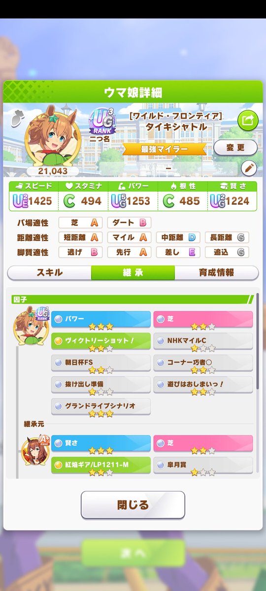 605: 名無しのトレーナー 2022/10/03(月) 22:23:05.99 ID:FmZoEQcfrどうせスキル取り切れないからタイキ外したら仕上がるようになったわ619: 名無しのトレーナー 2022/10/03(月) 22:25:35.03 ID:FmZoEQcfr貼り忘れた