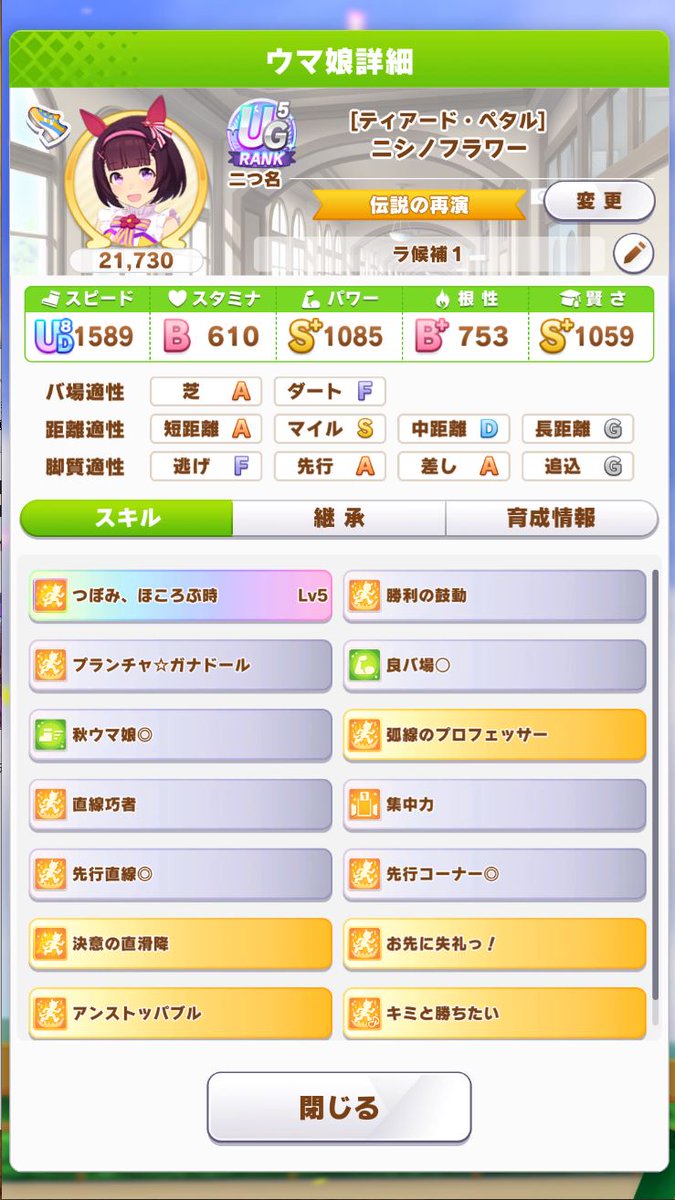 そう思うやろ?2ラウンドなると何故かニシノのが勝ちだす。短距離それでプラチナ取った454: 名無しのトレーナー 2022/10/05(水) 01:43:21.08 ID:qJNO4k8K0ニシノは固有出さえすれば最強レベルなはずなのにあんま勝たんのよね