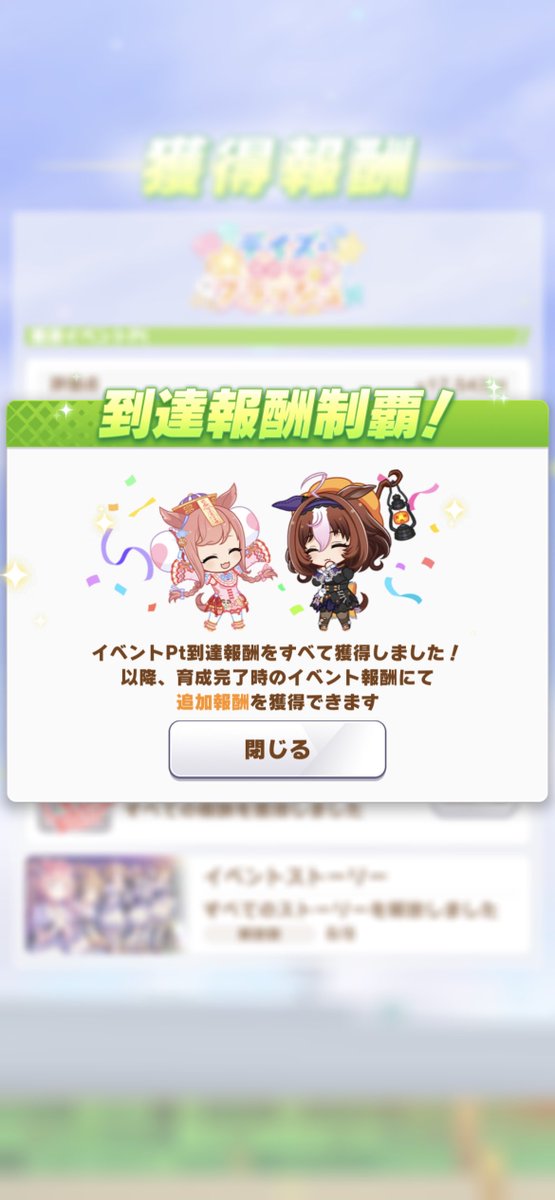 796: 名無しのトレーナー 2022/10/06(木) 23:01:11.33 ID:tjyUcRTd0昨日の夕方前からストーリーイベント進行して実質約10時間で100万pt完走出来ました。