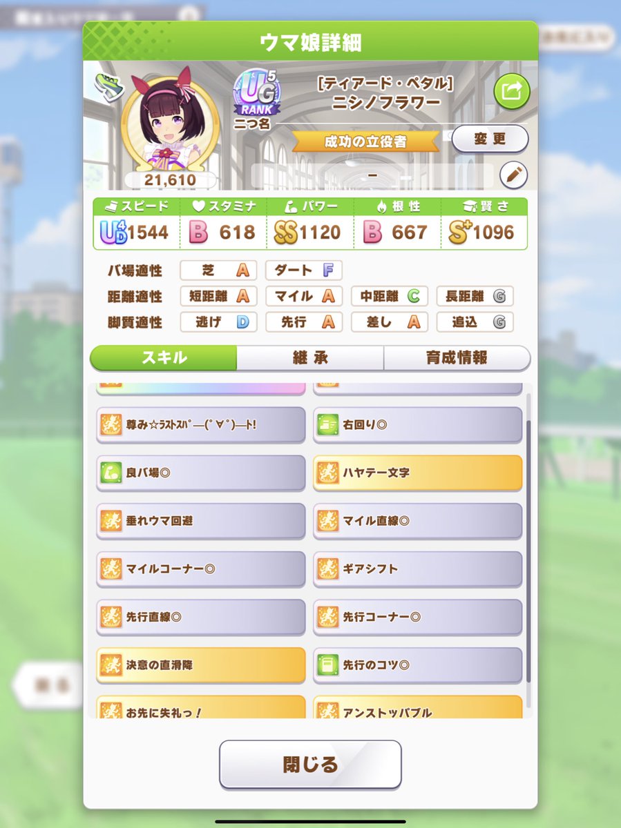 最近は短い距離でも加速スキルで即トップスピードになるので昔より距離Sの重要度は上がってる緑速度スキル(今回は右秋)は重要!出来るだけつけろって毎回言われてるが