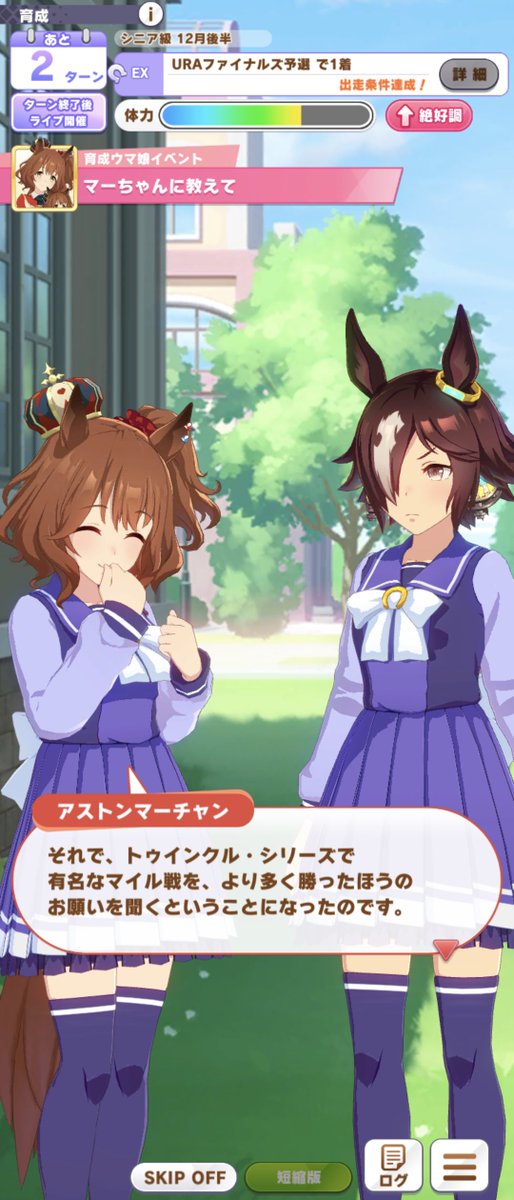 一応これ見た時は阪神JF、桜花賞、NHK、ヴィクトリアマイル、安田記念を勝ってた。さすがに具対数まではわからないけど。 pic.twitter.com/zT0huLHpow中距離適正Gのマーチャンに秋華賞とかに隠しイベがあるのなかなか鬼畜だけど、ウマ娘の醍醐味でもあるな。巧いよな。マーチャン中距離適性Gだし流石に隠しシナリオはないかなと思ったら秋華賞と秋天にあるっぽくて鬼畜すぎぃ!なんということだ…気がついてしまった…しかし、マーチャンの隠しイベントを見るためには修羅の道のりを歩まねばならない…マーチャン、秋華賞と秋天隠しイベあるってマ?