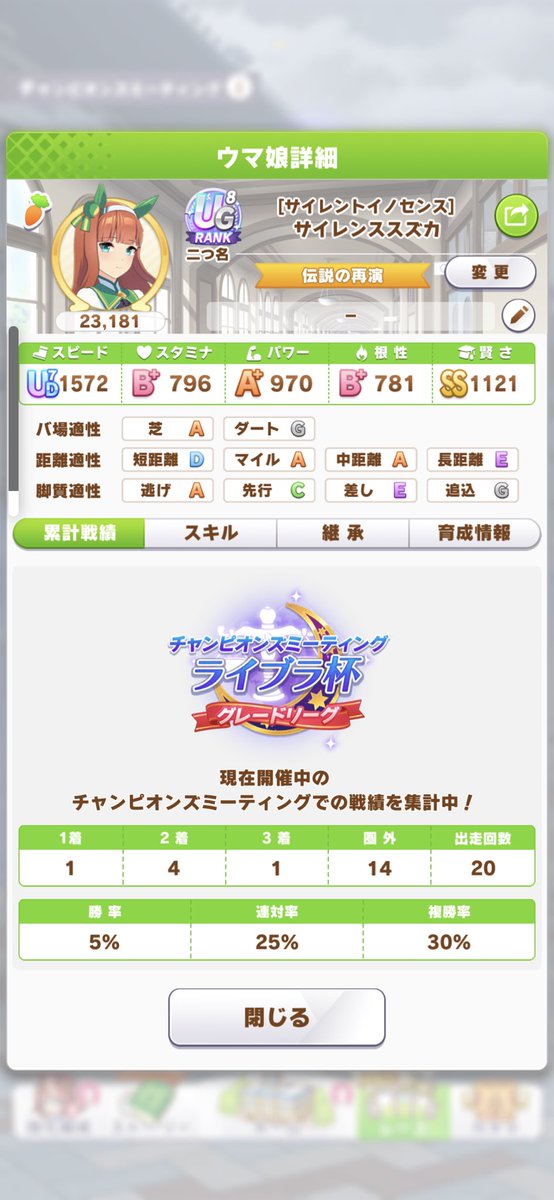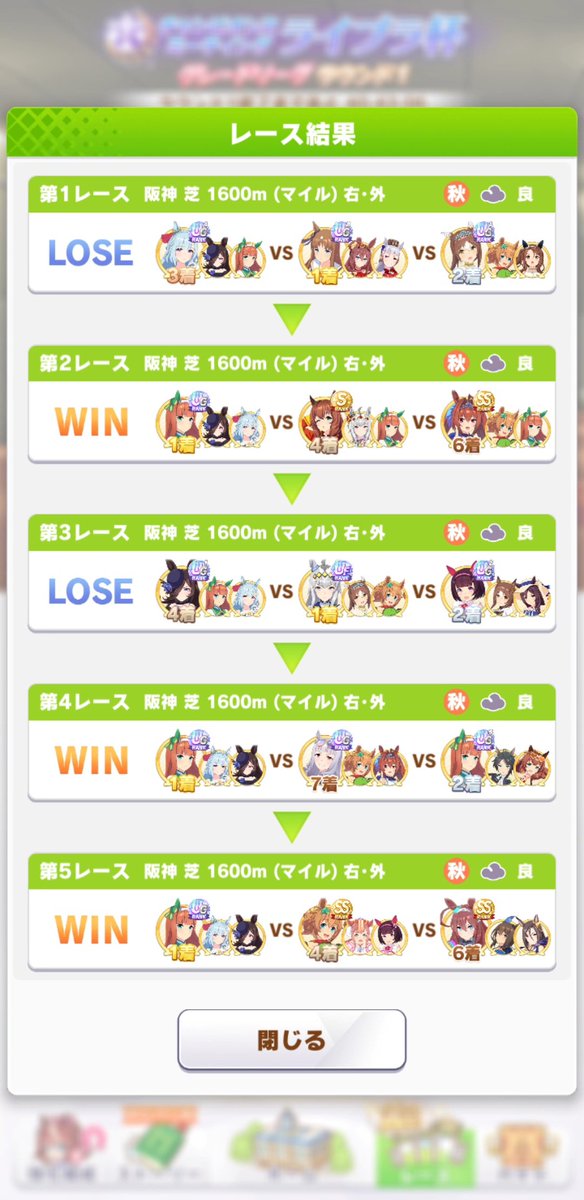 あと、大逃げ被るとその瞬間終わる。推しのスズカでライブラ杯ラウンド1突破!こういうのが出来るとすごく嬉しいですね!