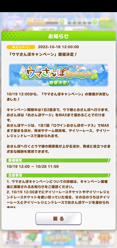 見れる子が限られそうだ名無しのトレーナーウマさんぽ…カイチョーがダジャレ言いながら各地を…(ちがいます)名無しのトレーナー10/19 12:00までにデイリーレースのチケットを消費していた場合おさんぽゲージは溜められませんすごい重要な情報出たよ!