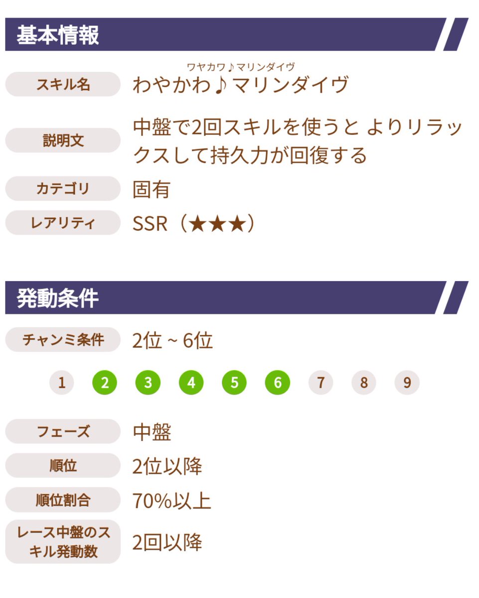 わやかわ♪マリンダイヴの順位条件が明示されてないの謎よな。中団に〜とかつけるだけでいいやんって思ったけどもしかして誰も使わんから気にしてないとかなんかな。「わやかわ♪マリンダイヴ」の発動条件って順位も関係してるのか。こないだ中盤でスキル2つ発動して少し後に「わやかわ~」発動したんだけど、スキル2つ発動後に順位条件を満たしたんだな新しい差しの金スキル回復固有で中盤速度スキルもある水着スペちゃんが使いこなせるんじゃないですかと思ったけど水着スペちゃんは順位指定があるのがつらい