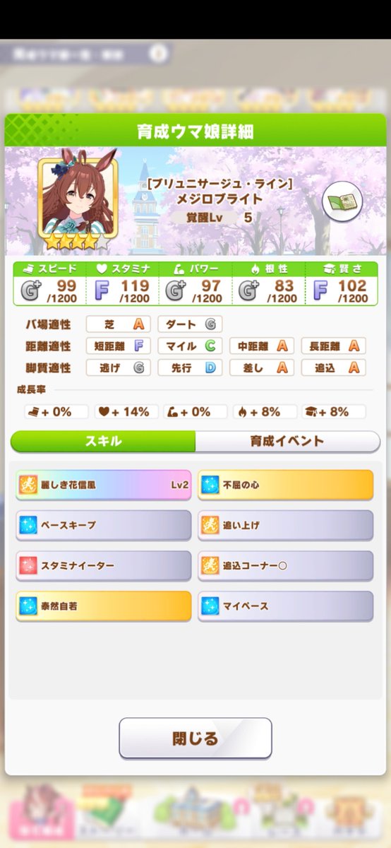 #メジロブライト pic.twitter.com/di7z2ki5RM結構無我夢中強いっぽいな。長距離来たらブライト差し育成は凄くありかも。