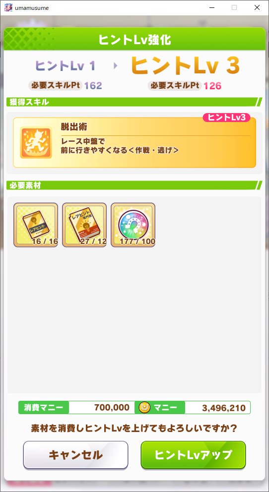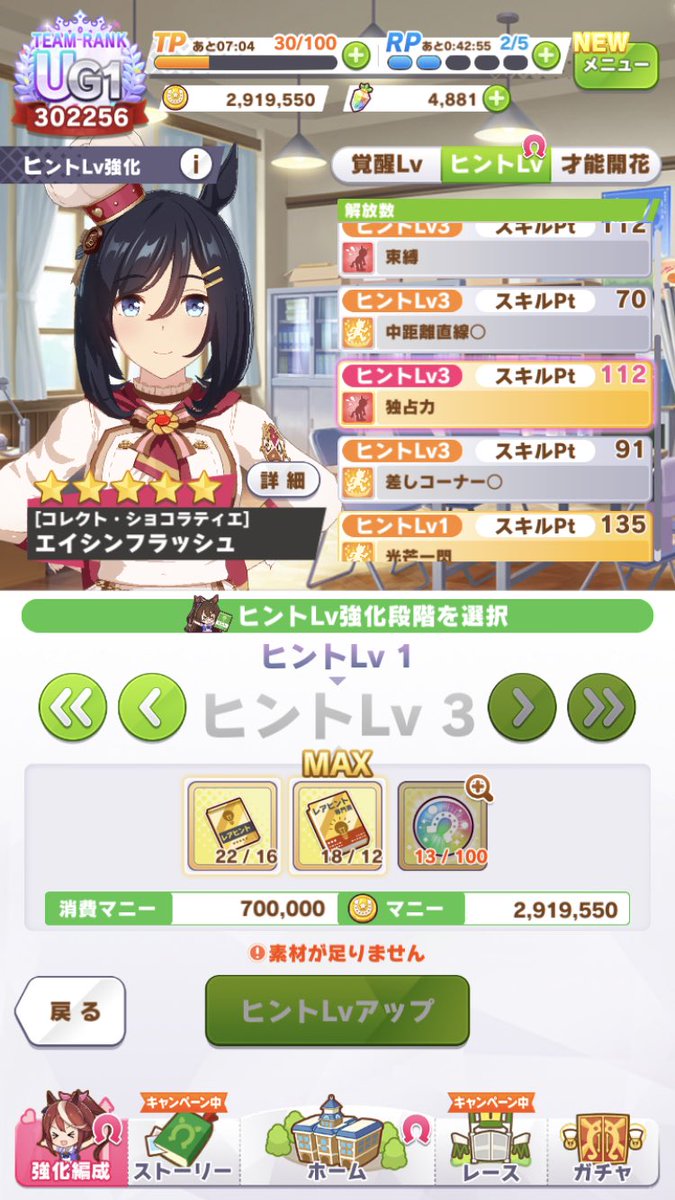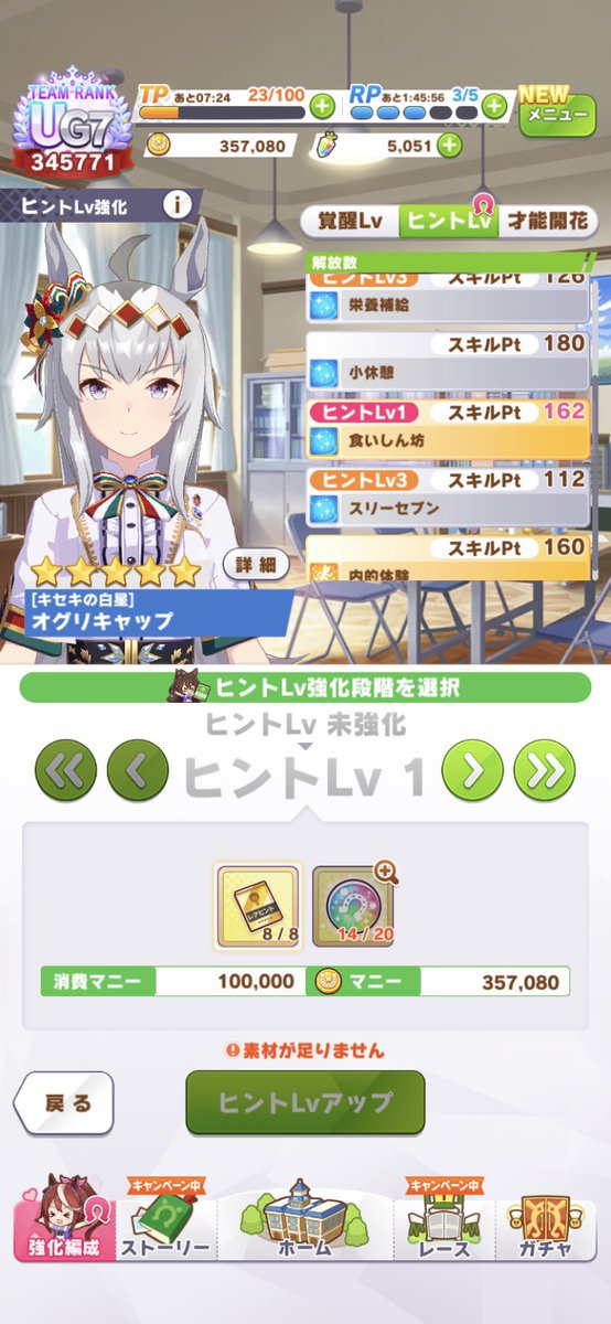 育成回数が多い、キャラ引いてない、ヒント本使ってない