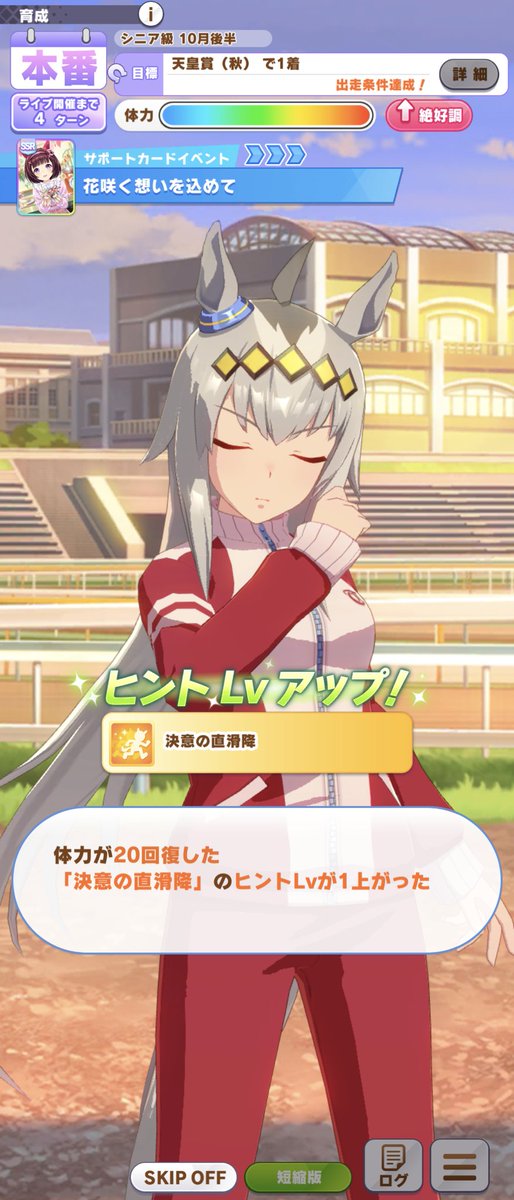ウマ1.3でクールダウンと一緒に修正して欲しいな35: 名無しのトレーナー 2022/11/02(水) 01:24:28.61 ID:LJqB//xtaってか好転強化したらますますマヤノが…38: 名無しのトレーナー 2022/11/02(水) 01:24:55.13 ID:e67q2HYp0好転酷い時ゴールの瞬間でるからな39: 名無しのトレーナー 2022/11/02(水) 01:25:37.79 ID:k+Do3yDp0好転は中盤限定にすれば人権43: 名無しのトレーナー 2022/11/02(水) 01:26:41.33 ID:NBOqzlPr0好転、一陣の風、全身全霊は「そこで出てもさぁ…」ってタイミングでよく見る