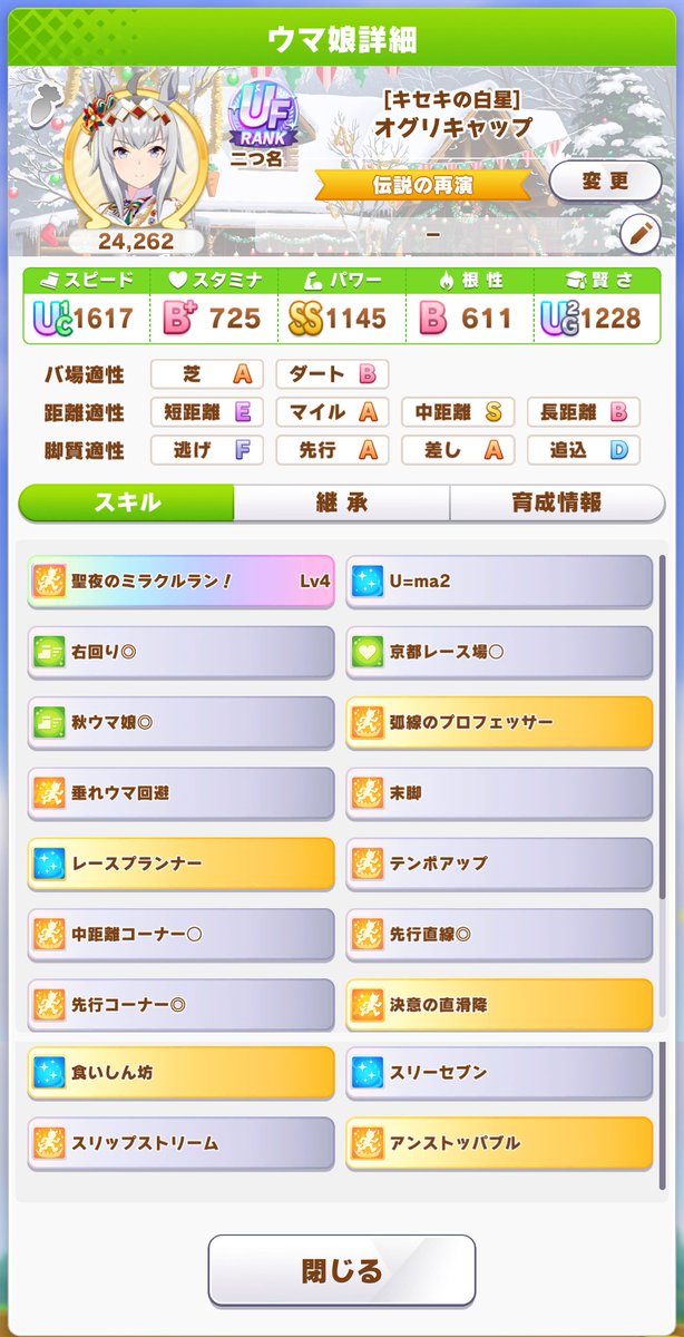 適当デバフ×2なら耐えられるけど、ガチめな奴だとスタミナ800クリオグリに金×2+継承タキオン固有スリセと全部発動してギリギリやからな