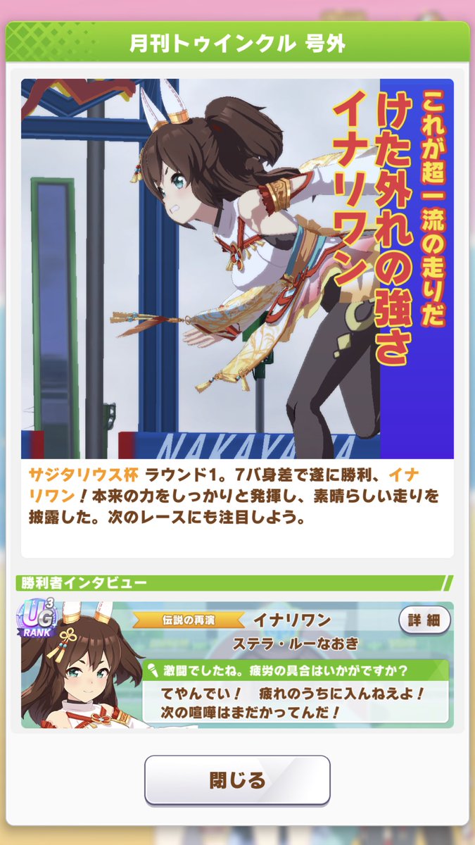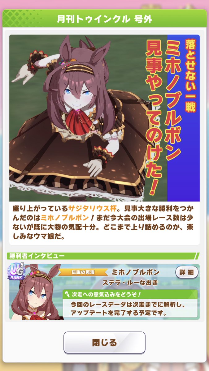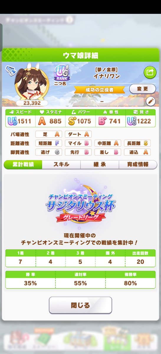 しかし最初に予定していたメンバーと随分と変わってしまった…結局キタちゃんと総大将スぺちゃんを出してないんだ。あんなに育成が難しいとは予想外だった