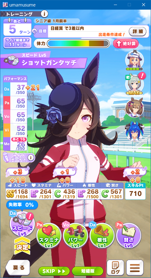 >>458を踏んだら友情トレ+65%の3ターン中1ターン損するやん