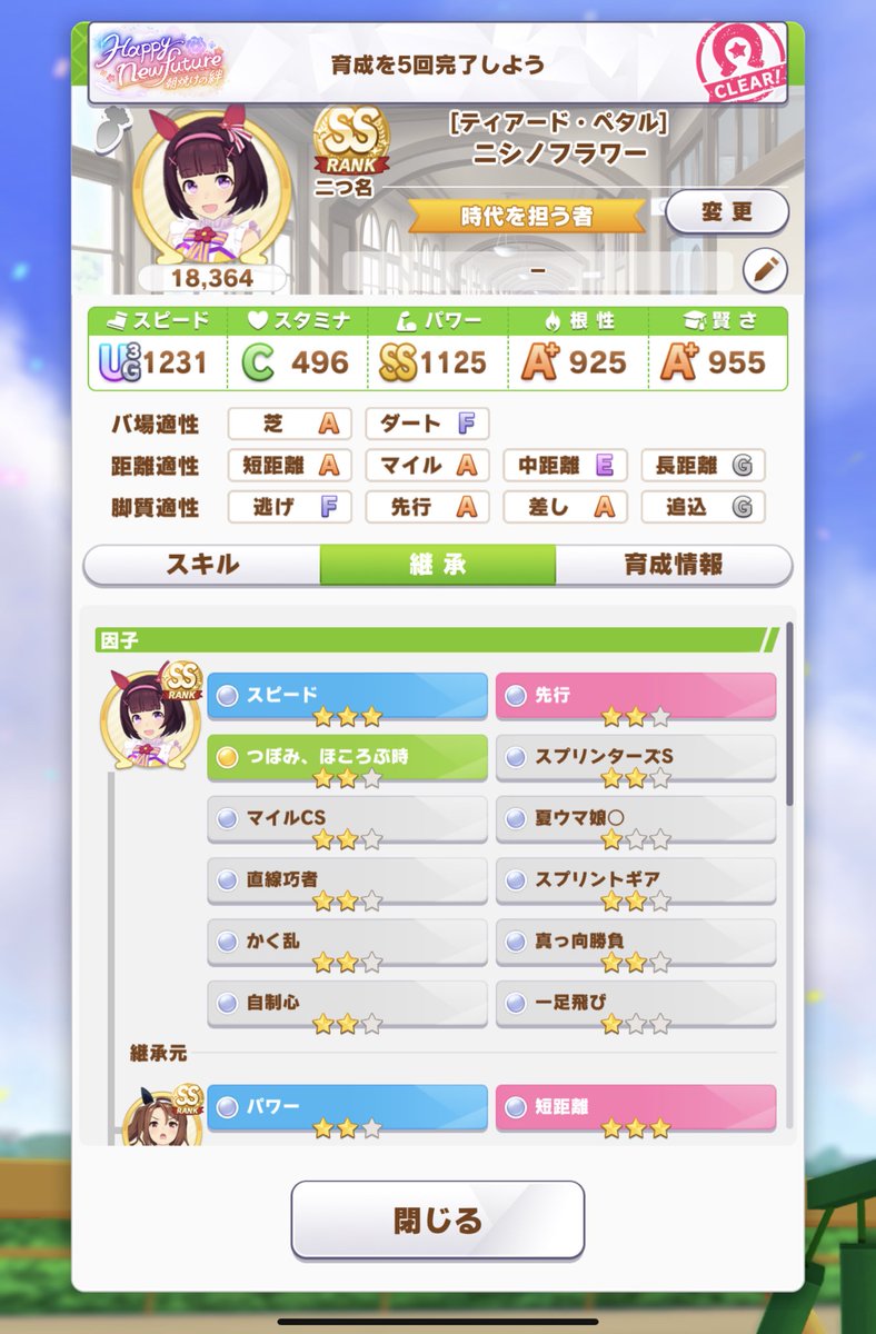 106: 名無しのトレーナー 2023/01/03(火) 10:36:15.74 ID:jRhZM5ph0短距離マイルでしか走れないウマの因子周回ってステ盛るコツある?