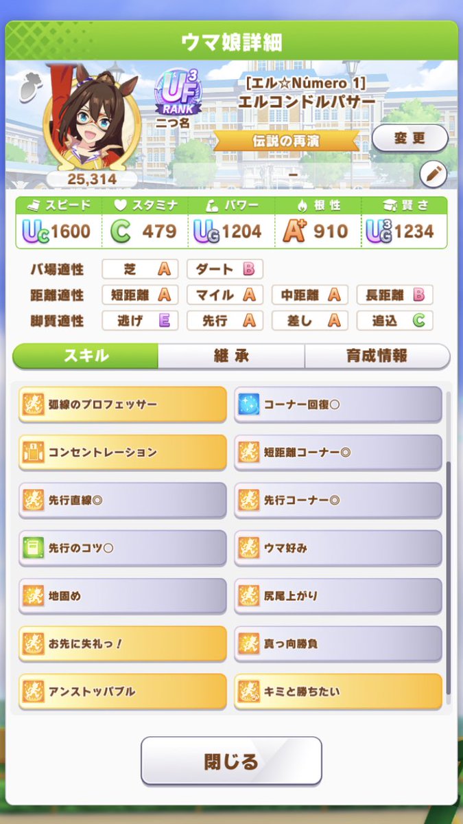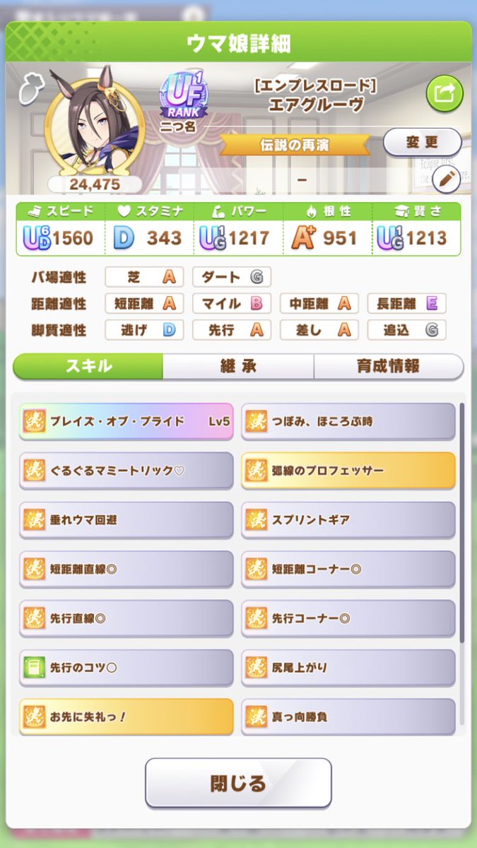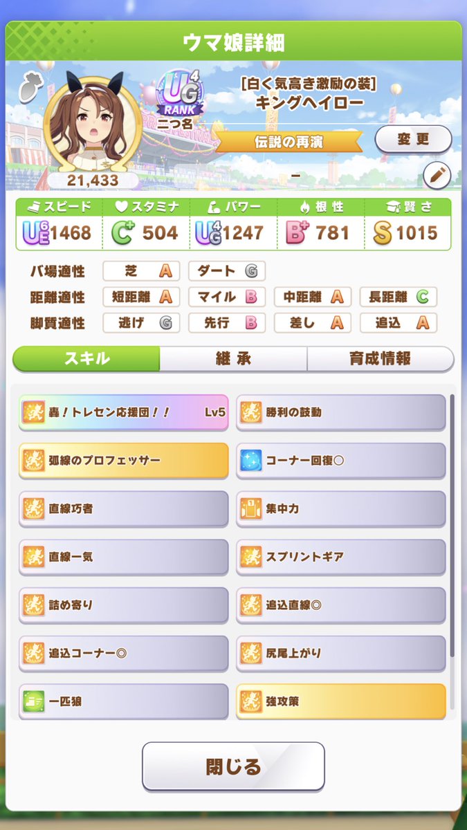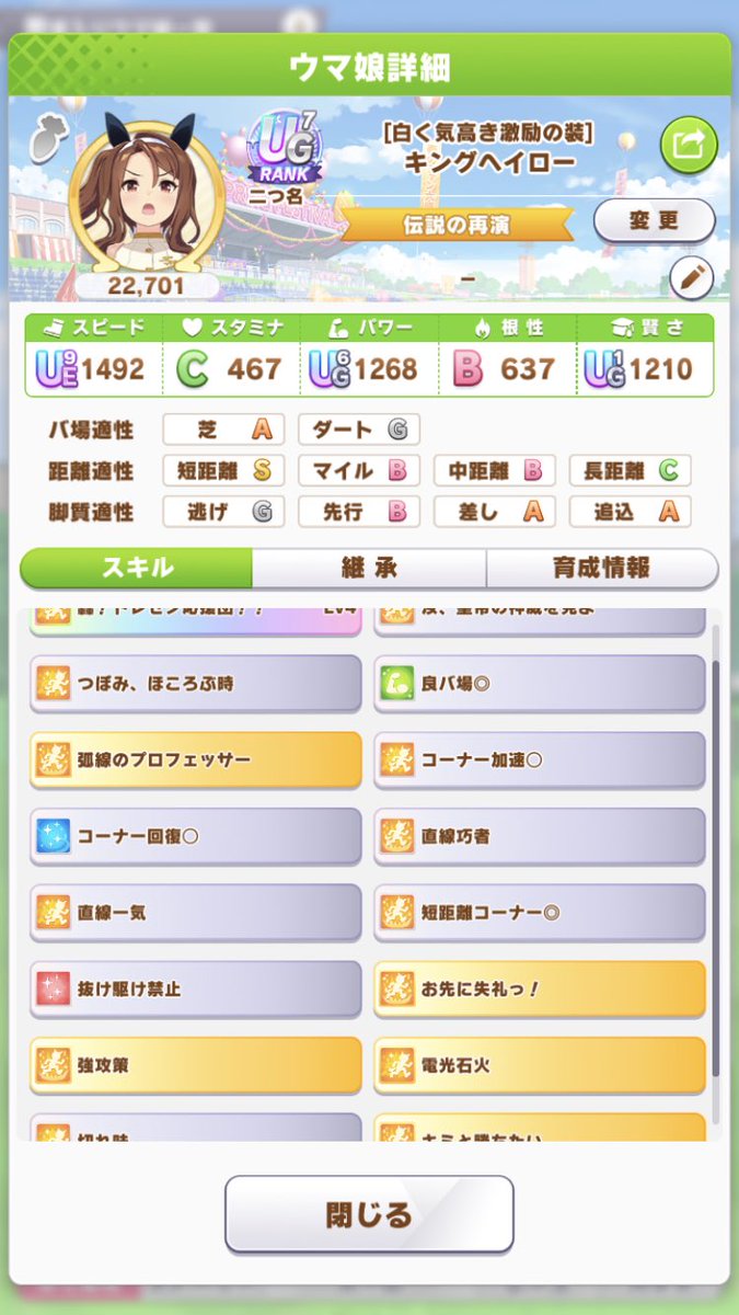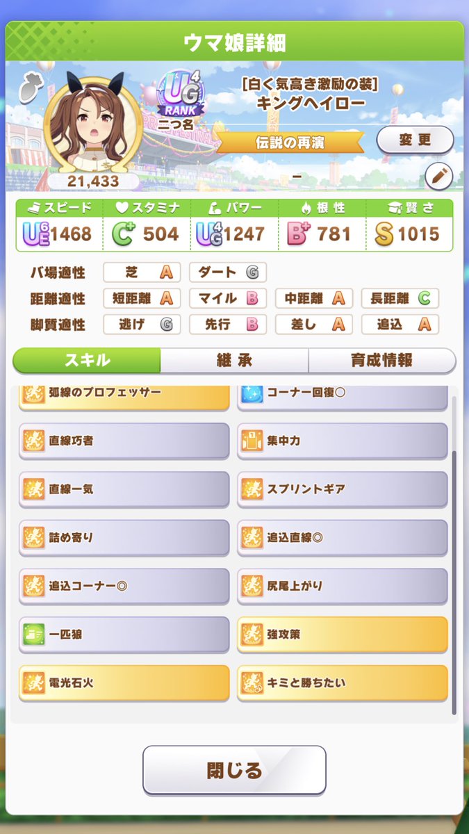 でも、電光石火、強攻策、直線一気、勝利の鼓動と付けたいスキルは付けれたので、このキングでチャンミ挑みます。 pic.twitter.com/TWqesguUFu