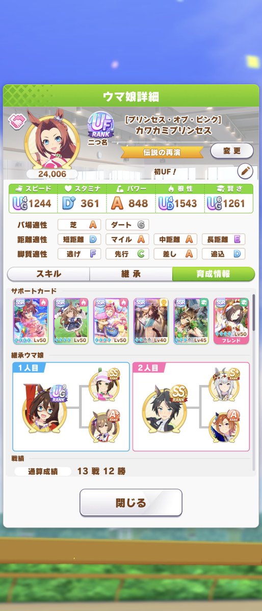 カワカミプリンセスで初UF達成!グランドライブ環境でも根性育成の可能性を感じた、これスピパワ成長率なら相当強くなるんじゃないか?全然意識してなかったが根性サポカ配布だけだったwこれにて名トレーナーへの道!第4弾もミッションコンプリートだ! #ウマ娘 pic.twitter.com/KzZV4KXHI4グランドライブ最高得点更新した。継承元にもっといいのが作れればUF行けそうやなカレンチャンはメイクラやと相性悪すぎてまともに育成出来なかったからなんか嬉しいわ pic.twitter.com/pEHy2FvG8t