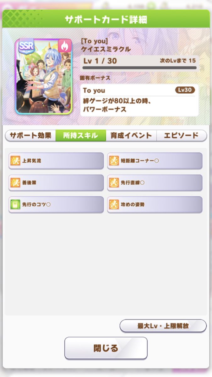 ケイエスミラクルのサポカ説明文だけで泣けるな……というか泣いちゃったな……ってなってたら奥の方にさあ…………なんでそんなことするの!!!???!!? 絶対幸せにしたいわよ……😭😭😭ケイエスミラクルのサポカ