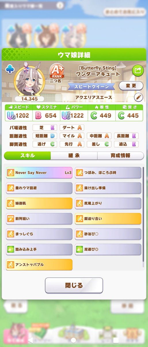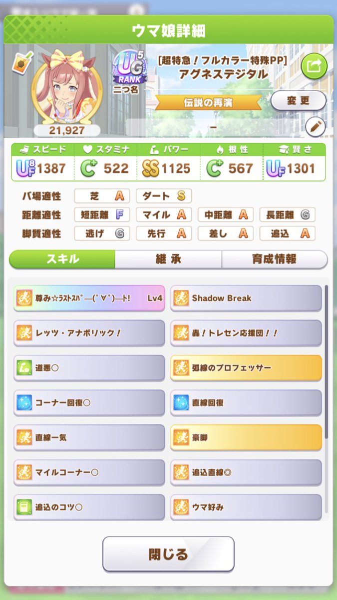 自分にはありがたい603: 名無しのトレーナー 2023/02/05(日) 11:47:13.82 ID:a8pnyyXI0タルタル出したいのにルムマだと逃げか追込しかいないから固有出ないな…固有出ると継承つぼみも+されたぶっ飛び具合が大好きなんだが607: 名無しのトレーナー 2023/02/05(日) 11:49:01.45 ID:xri/SQ++0>>603