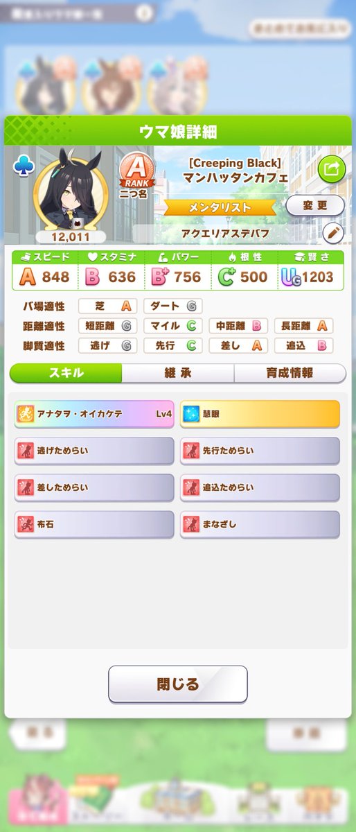 第2回アクエリアス杯へ向けて。手持ちで芝適性の低いのが3人いたのでメンバーはこれで行こうと。ルムマで数日前はファル子が逃亡者決まれば勝てる感じだったのが今日はサッパリ勝てず。ウララちゃんが上がり過ぎたりするし、逃げリッキーでも用意してみようかなあ pic.twitter.com/IkYEdkvN43アクエリアス杯の暫定メンバーです。