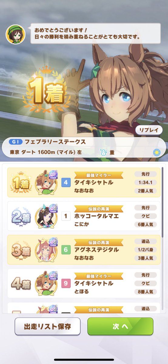 良いですね、デジたんとそれほど勝率が変わらないのは。私はもうデジたんばかり勝ちますね、タイキちゃんはたまにでリッキーちゃんはもう全然。