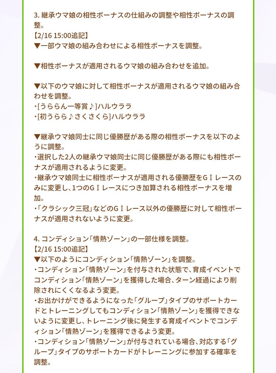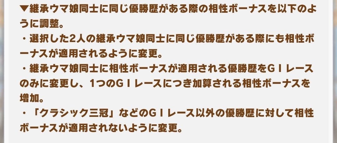 * 継承ウマ娘同士に相性ボーナスが適用される優勝歴をG1レースのみに変更し、1つのG1レースにつき加算される相性ボーナスを增加。読み直したらボーナス対象がG1のみなのは両親間だけで、親ー祖父ラインはG2G3も対象になるような感じだなこれ
