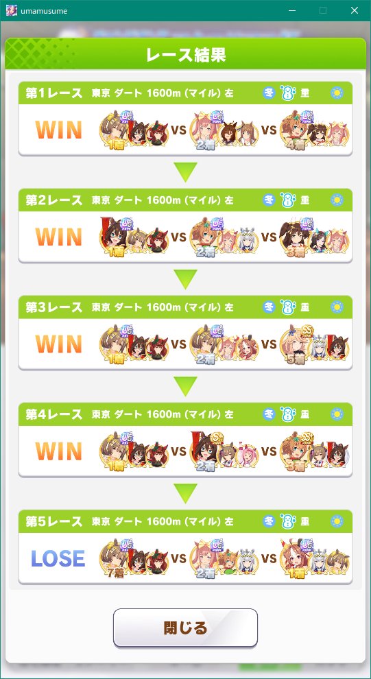 タルマエは1勝のみw 今回自分の先行が1人なので固有条件的にラウンド1では弱いとわかっていたwpic.twitter.com/XTmNm3fNp9 9ファル子と逃げエルにデバフネイチャを入れてスタミナ甘い奴らを脱落させる作戦で勝ち逃げできた。今はこれで何とかなるけど、ラウンド2以降は通じないだろうなあ、、、5レース目はハナ取れずに負けたんだけど、ハナ取った相手の逃げリッキーがアタマ差で追込デジたんに勝って逃げ全勝なのは嬉しい。 pic.twitter.com/yrsQbjwgvw123フィニッシュでの勝ちを確信してたらデジタルとタイキが立ったからビビった