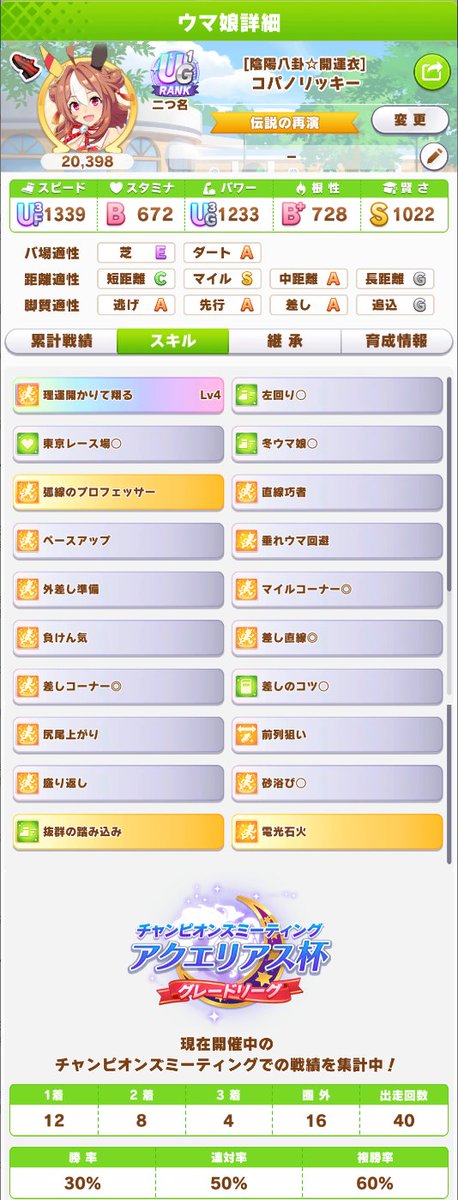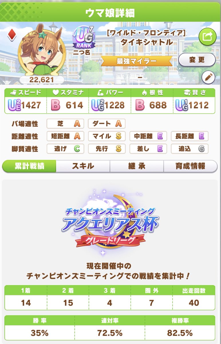 過去一123多いわ、追い比べの重要さを学んだかも640: 名無しのトレーナー 2023/02/18(土) 13:01:08.59 ID:6KTz9hUzdまだラウンド1だからアレだけど、適当に作ったタイキがそこそこ勝つな