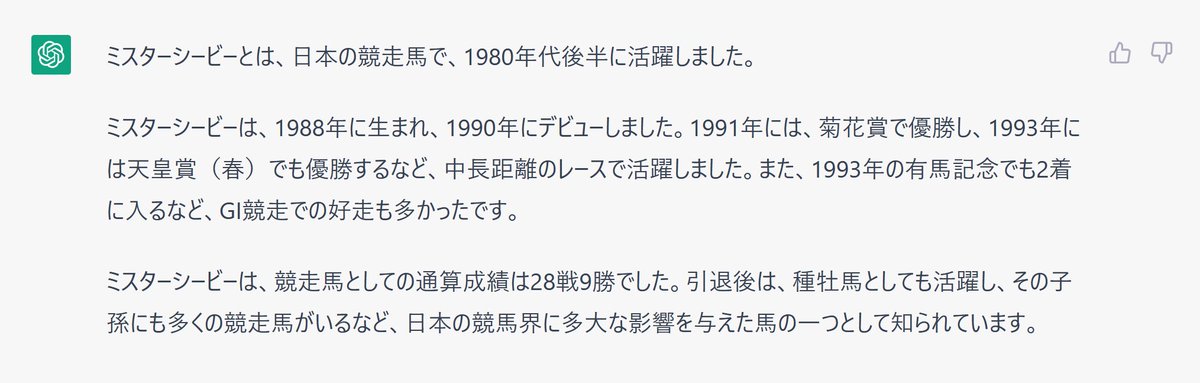 ウマ娘で実装されたので、ChatGPTに、モデルの馬について聞いてみたら、何か色々と間違ってる。