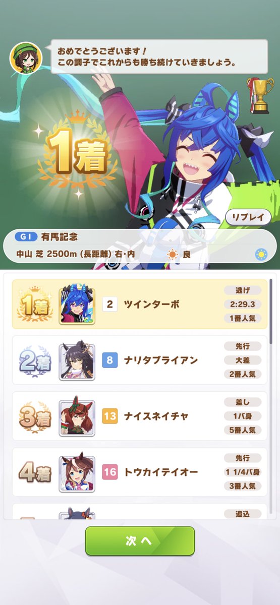 ターボちゃんのシナリオは全体的に本当に面白かったですね~!ただ私はまだ有馬記念には勝利してない…でもテイオーちゃんが勝ってる姿はそれはそれで嬉しい。シナリオの流れ的に