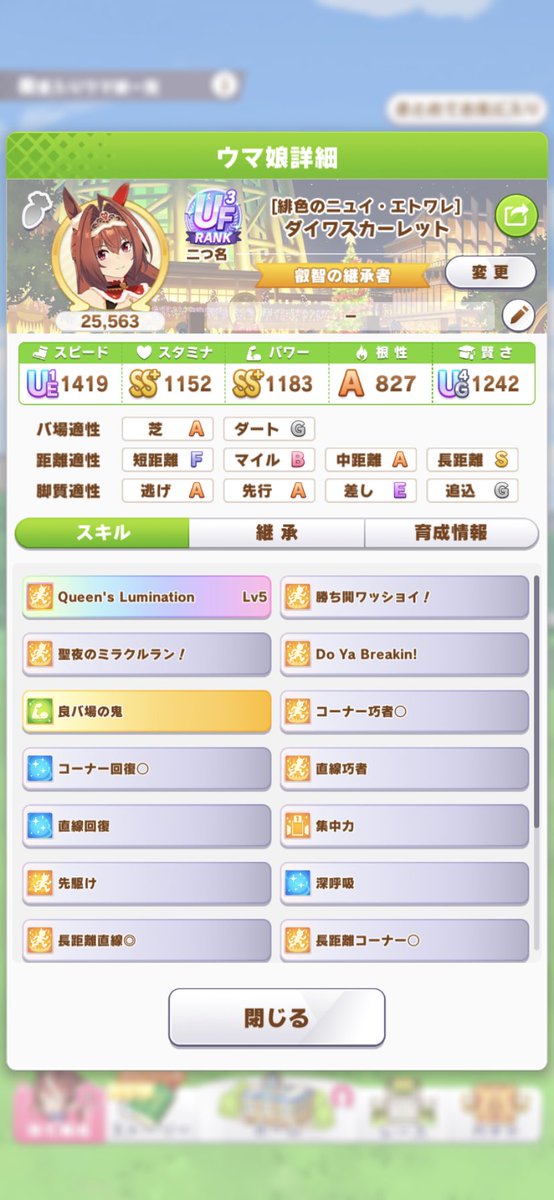 チームの脚質的に逃げ一人出そうかなと考えましたがやっぱり単逃げはマズそうなので断念いたしました。パーマーちゃん持っていたら大逃げ運用も考えてましたが持ってないんですよね