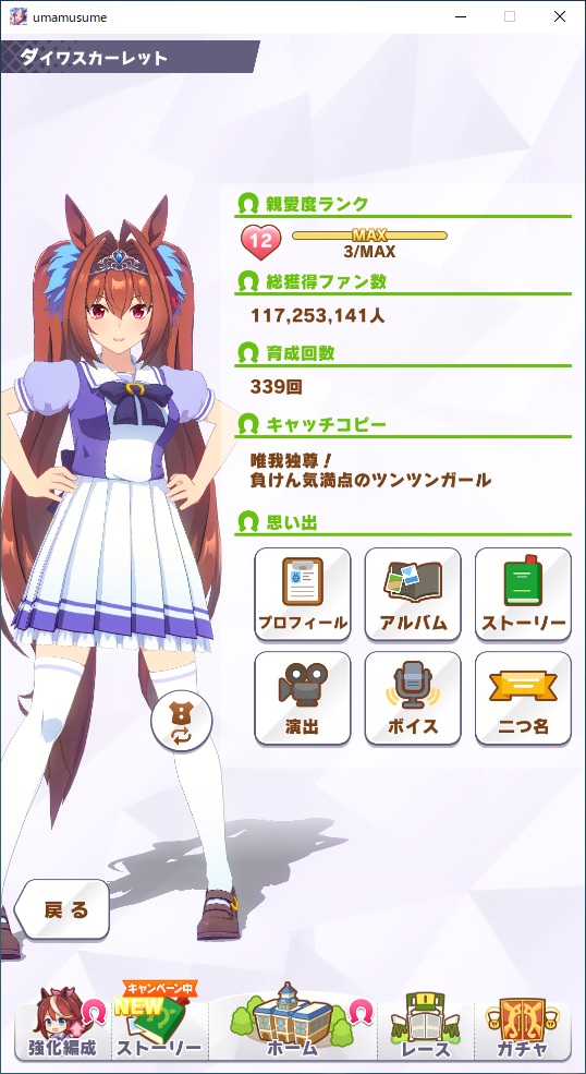 総獲得ファン数、育成回数共にウオッカのほうが多いのにダイワスカーレットのほうが親愛度ランクが高い上限解放後、クリスマス衣装のダスカばかり育ててるからだけど