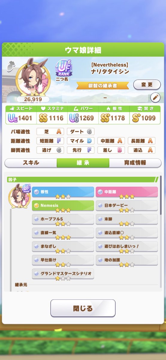 自分はステータス整えやすいスピ3(フクキタル含む)スタ1賢1女神でやってるけど上目指すならスピ2に減らして賢2にしないと多分無理だわ131: 名無しのトレーナー 2023/04/12(水) 01:31:35.71 ID:oebvpu2ha>>127