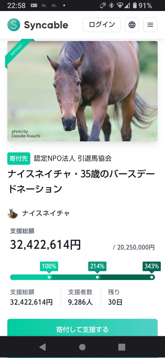 今年も凄いなナイスネイチャのバースデードネーション3000万とか集まっててワロタ
