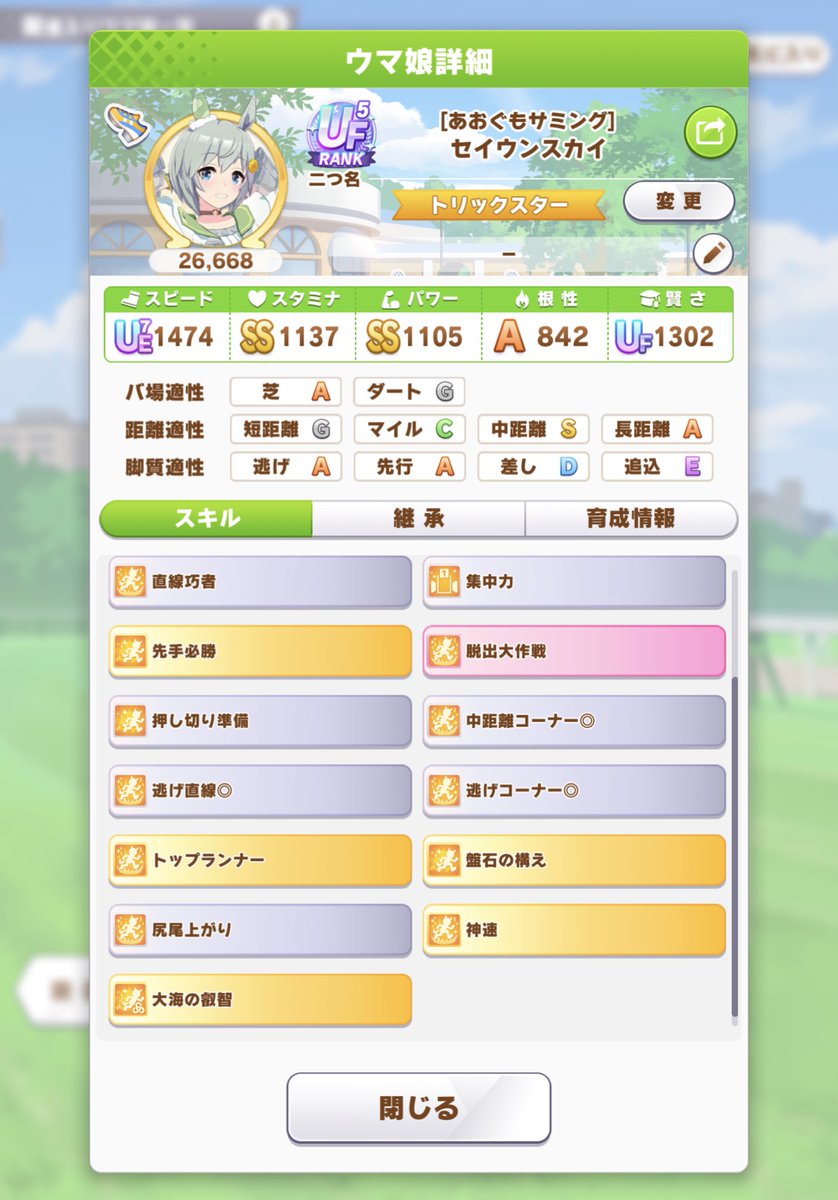 ありがとう485: 名無しのトレーナー 2023/05/04(木) 13:19:35.78 ID:Ph2f1EPC0大海は先行で巧みなステップの代わりに白で取っとくか程度のスキル
