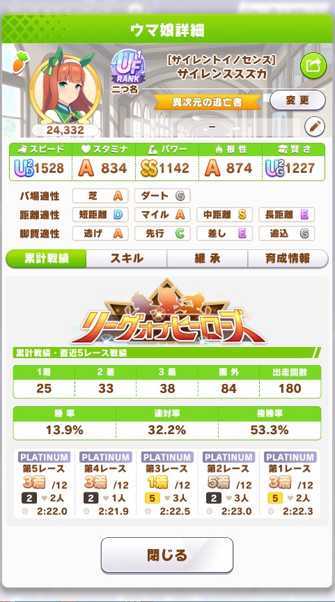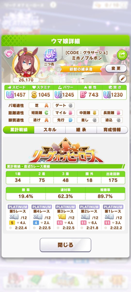 まあ勝てた時の喜びもひとしおなんですけど名無しのトレーナーもう全部あのウマ娘一人でいいんじゃないかな名無しのトレーナーフラッシュしか(ほとんど)勝たん名無しのトレーナーチョコフラ強いよなぁ名無しのトレーナーなんのかんのウオッカ強かったわ名無しのトレーナー勝率一位じゃなくてもある程度安定した成績残せればいいってのがいいね名無しのトレーナー勝率90%でも3万いかんのかあ名無しのトレーナー1着だけ取っても他が4着とかだったらポイント一気に下がるからねぇ名無しのトレーナー1着5着よりも2〜4着独占の方がトータルポイント高いからね名無しのトレーナー数字で言うなら今回は連対率とかも高くないとポイントには結びつかないよね名無しのトレーナーチャンミと大きく異なる点よね