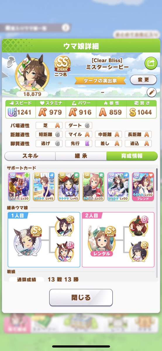 マイル中距離チャンミはUF8くらいが主力だったけど長距離チャンミの時はUF4くらいだった名無しのトレーナー多分次回長距離チャンミはジャンポケのおかげで評価値持ったの結構来ると思うよ名無しのトレーナー長距離をこれ以上盛るには完全長距離用かつレスボも高い賢さのほうが必要だと思う名無しのトレーナー長距離と短距離の両端は